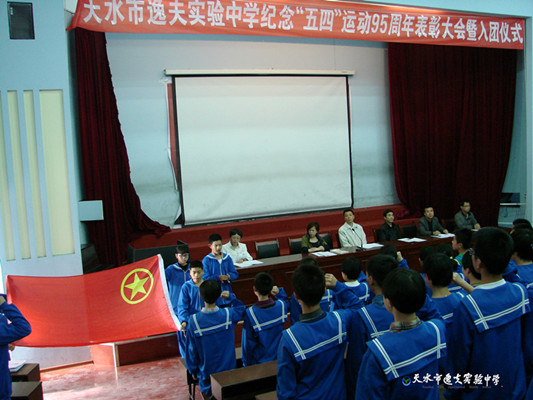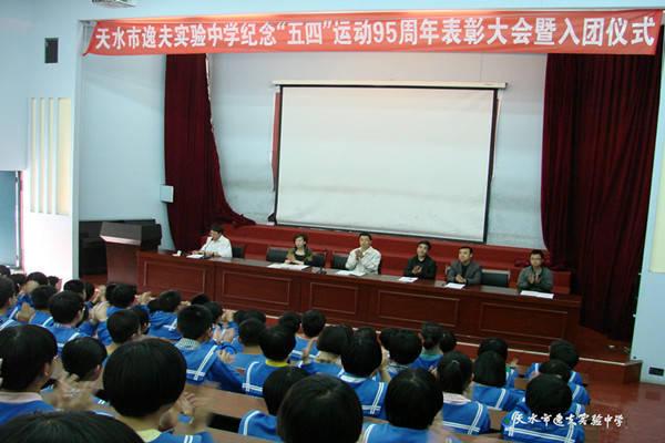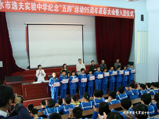 5月4日,在“五四”运动95周年来临之际,逸夫中学校团委召开了纪念“五四”运动95周年团员表彰大会暨新团员入团宣誓仪式。来自八、九年级的团员代表及新团员共300多人齐聚阶梯教室,以虔敬的心情迎接新团员,接受表彰奖励,传递理想与信念,共话执着与追求。学校领导出席大会并表彰奖励优秀团员。