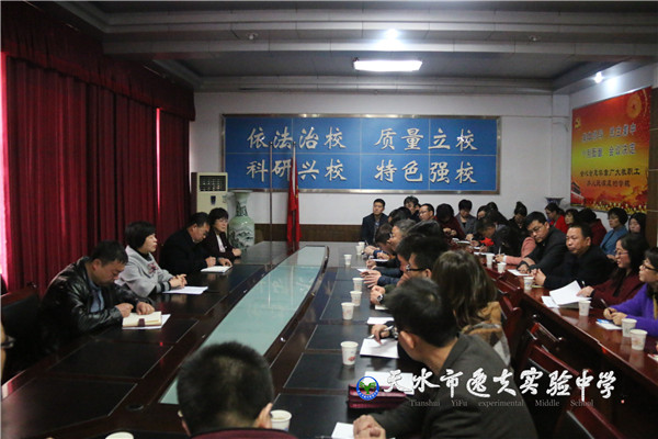 天水市教育局副局长、市逸夫实验中学校长沈建玲和学校三位副校长一起与甘谷新兴中学领导教师进行了座谈交流。座谈会上沈建玲校长首先对新兴中学领导与教师的到来表示热烈的欢迎,并介绍我校的教育教学发展情况。接着两校领导共表互学互助,共同发展的真诚愿望。