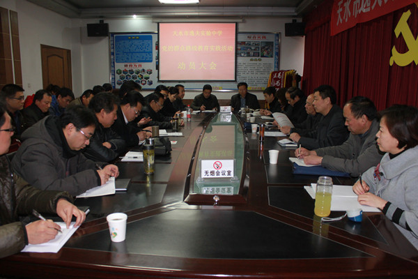 三阳开泰,大地回春,2月22日下午,365bet游戏网站党的群众路线教育实践活动动员大会在校实验楼三楼会议室召开。以市交通运输局党组副书记张栓科为组长的第十督导组一行4人 ,校领导班子陈建民、沈建玲、宋继凯七人在主席台就坐。学校全体在职党员和中层以上领导干部、年级组负责人共49人参加会议。