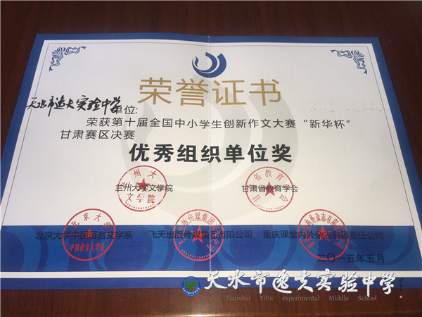 在刚刚结束的第十届全国中小学生创新作文大赛 “新华杯”甘肃赛区决赛中,市逸夫实验中学取得两人获一等奖、三人获二等奖、二人获三等奖、学校获优秀组织奖的骄人成绩。