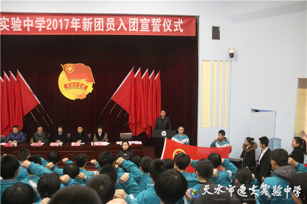校团委书记杨小刚主持大会,并宣布入团仪式开始,全体起立,奏响国歌。接着宣布新团员名单,由老团员代表向新团员佩戴团徽。然后校团委张馨老师带领新团员宣誓。鲜艳的团旗下,新团员举起右手庄严宣誓:“我志愿加入中国共产主义青年团,坚决拥护中国共产党的领导,遵守团的章程,为共产主义而奋斗。”青春誓言,高昂雄浑,表达了同学们对共青团组织的无限向往和为团组织增光添彩的豪迈激情。在热烈的掌声中,团员代表九年级一班王铎同学做了发言,他表示要在各方面不断提高自身素质和修养,为团组织增添光彩。