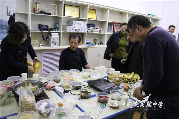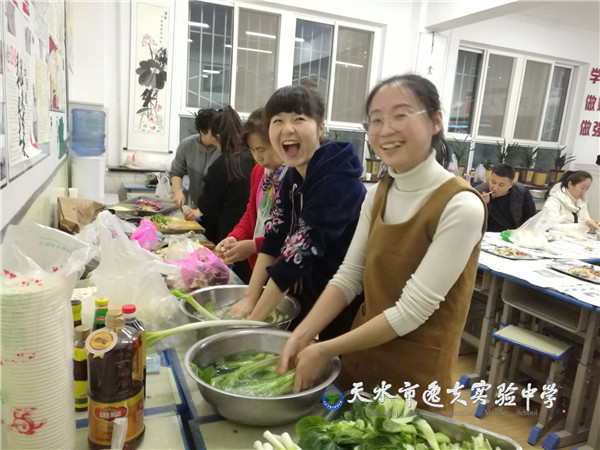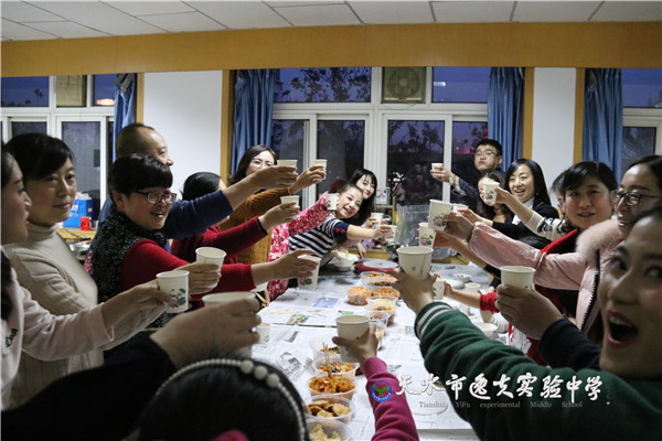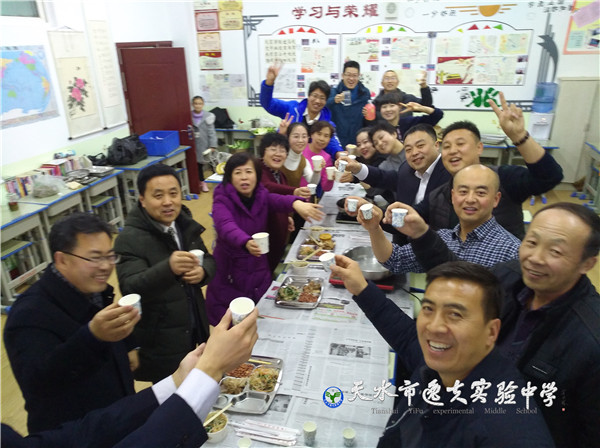 更精彩的是各教研组早就自发自费倡议组织起来,要在辞旧迎新的时刻,学科人叙旧共迎新年。于是,全体老师以教研组为单位以教室为阵地的大聚餐活动又开始了。不必说理化组的饺子,政史地生组的“大菜”,也不必说语文组、英语组的火锅,数学组的西餐,单就体育艺术综合组的水果、凉菜、羊排和美酒,就让人感受到浓浓的幸福和“一家人”的温暖。
