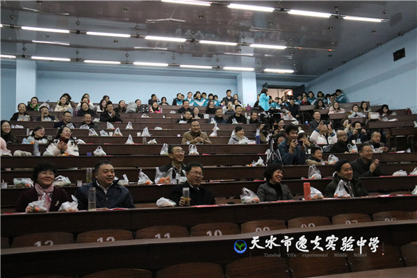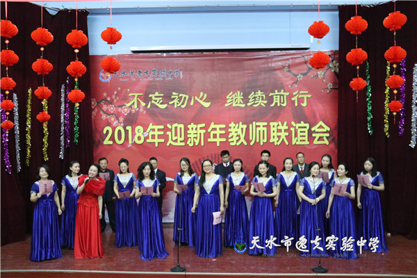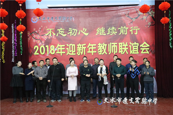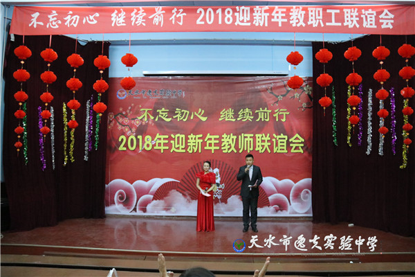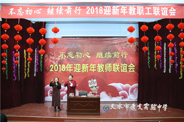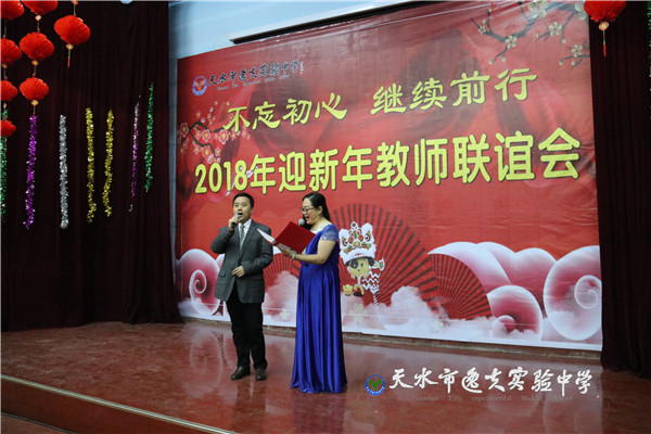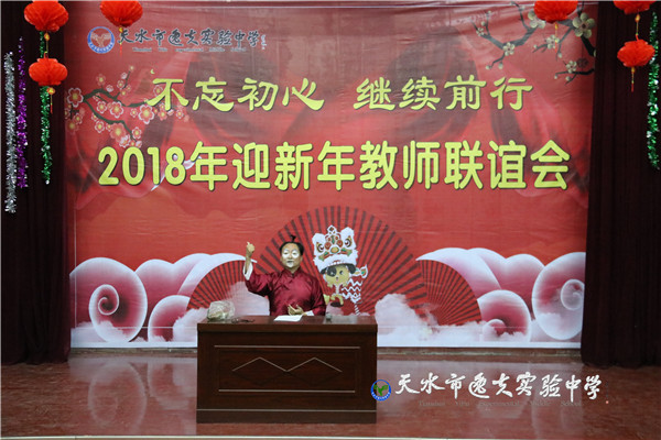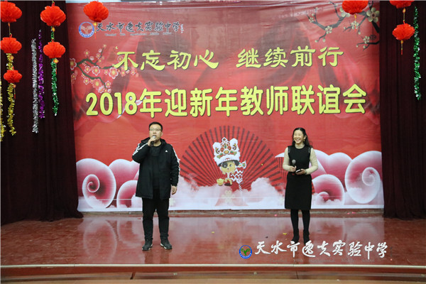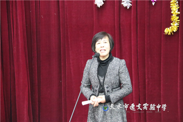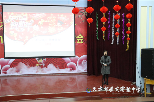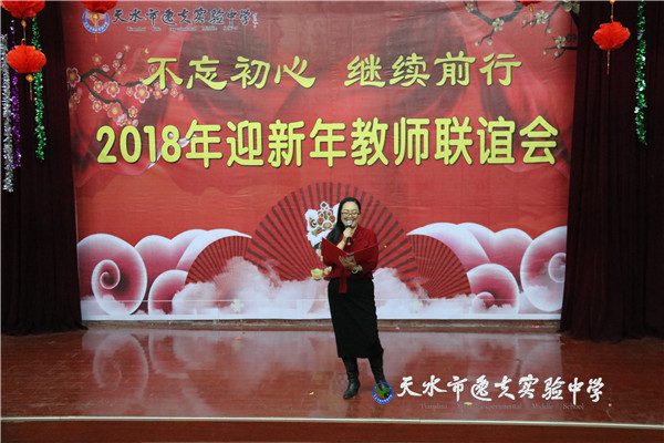 在主持人热情四溢的开场白之后,天水市教育局副局长、市逸夫实验中学校长沈建玲发表了饱含深情的致辞。她以一首现代诗《写给孩子》进入回顾,以一首古诗词《南乡子·2018元旦抒怀》做结,总结回顾了2017年学校的发展,回顾了2017年学校走过的每一个闪光的足迹和可圈可点的工作业绩,历数了一年来学校老中青教师团队给学校发展做出的贡献和付出的心血,希望全体逸夫人进一步凝心聚力、锐意进取,走向又一个辉煌的年轮。她还说:“新年的钟声如期而至,时间的长河就要卷起一朵崭新的浪花,每一个生命都抛去一轮旧尘,踏进2018新春的门槛。今天,我们稍微放缓脚步,在如飞的岁月里梳理我们短暂的工作时光。”在一阵又一阵的掌声中,全体教职工感怀往事,展望未来。