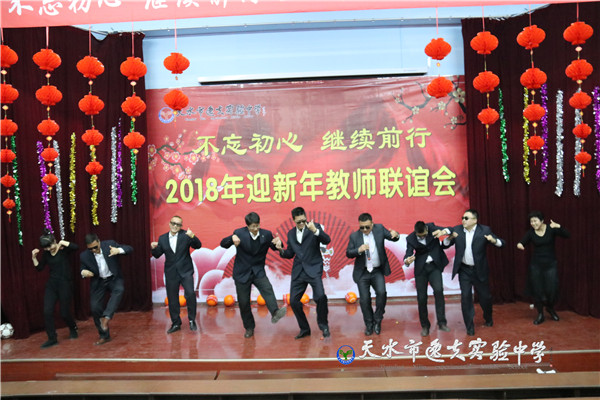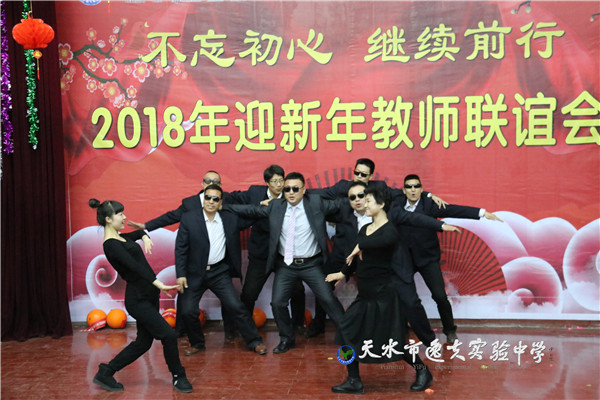 接下来,精彩纷呈的文艺演出正式开始。首先是全体英语老师表演的舞蹈《花桥流水》——美轮美奂的造型、优雅的舞姿,赢得了全体教职工热烈的掌声。接着,校党支部书记周和平与董洛秦老师演唱的歌曲《为了谁》,抒发了全体逸夫人奉献的情怀。政史地生组毫不示弱,由赵培、赵鸿斌、王红、刘希佳、马瑜瑶、周兰玲、姚玫、雷雄雄老师表演的小品《常回家看看》,将亲情演绎得细腻感人。艺术组冯梅溪、张馨老师的双簧《贺新年》幽默生动,趣味盎然,吸引了众多的眼球。谁说理科老师才艺逊色?且看理化组邱明坤、郭纪文老师的男女二重唱《祖国之恋》,不让专业水准;数学组全体老师的合唱《壮志在我胸》豪气云干,荡气回肠。最精彩的要数体育组全体老师了,他们新颖的创意、“酷毙”的造型,将《快乐体育》诠释得淋漓尽致。全体语文组老师上场了,只见女老师一律着宝石蓝晚礼服,男老师西装革领,激情合唱《明天会更好》,将全场的情绪推向了高潮。音乐组老师的小合唱《异乡人》更是听得人如醉如痴。嗨翻全场的文艺表演中,还穿插着“踩气球”、“抢凳子”、“萝卜蹲”等令人捧腹大笑的有奖游戏,整场演出掌声笑声不断,气氛热烈,传达出逸夫实验中学团结向上的校风和充满年轻活力、其乐融融的“家”文化。最后,联欢会在五位校领导热情洋溢的贺词中徐徐落下帷幕。