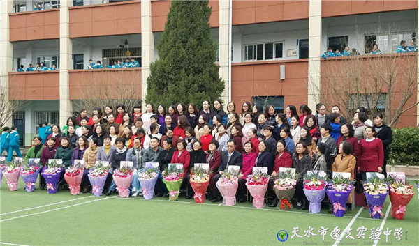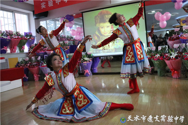庆祝活动在全体女教工集体演唱《铿锵玫瑰》的歌声中拉开帷幕。首先由学校党支部书记周和平、副校长周旭忠、副校长花明向50岁以上的女教师们献花并致以节日的祝福。副校长计卫珍代表女教师们讲话,她以自己三十多年的教育经历,鼓励年轻教师,事业、家庭是我们幸福的共同源泉,要以满腔热诚走好女性光彩的人生路。她深情地说,“虽然我们老了,但是,要为天水初中教育发挥我们的余热,引领年轻女教师为我们精彩的人生努力。”