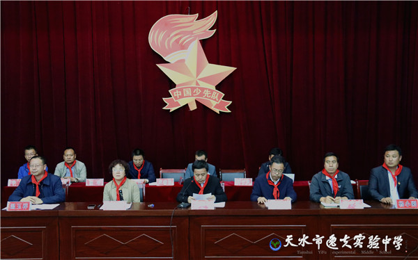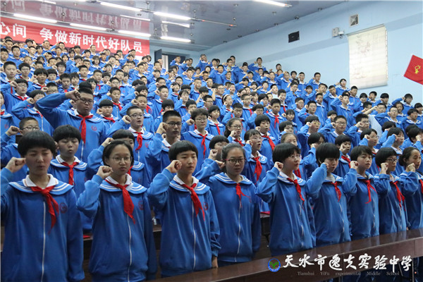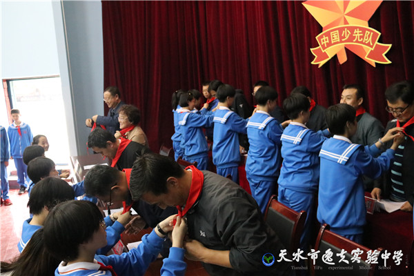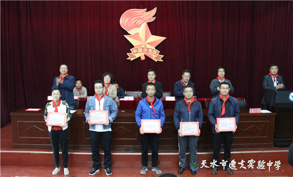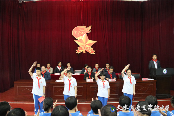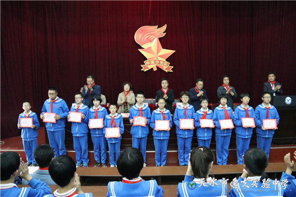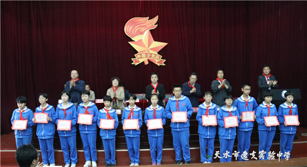 在高亢嘹亮的国歌声中,表彰大会拉开了帷幕。大会气氛庄严肃穆,首先由少先队员代表为校领导及少先队辅导员佩戴了红领巾,随后,优秀少先队员代表、七年级十二班丁凡晢等同学作了富有激情的献词。副校长周旭忠宣读了荣获“全国优秀动感中队”获奖班级和2018年天水市“最美红领巾”、“最美优秀少先队辅导员”、“优秀动感中队”表彰决定。副校长计卫珍宣读了365bet游戏网站2017—2018学年度“优秀少先队员”“优秀少先队干部”“优秀少先队辅导员”“优秀动感中队”的表彰决定。伴随着激昂的颁奖音乐,校领导为获奖集体及个人颁发了奖牌和证书。最后,365bet游戏网站党支部书记周和平作了重要讲话,周书记给全体少先队员提出了三点希望:希望少先队员们从小培养良好的人生观、世界观;希望少先队员们心怀梦想,努力奋斗;希望少先队员们在实践体验活动中勤学苦练、奋勇向前。